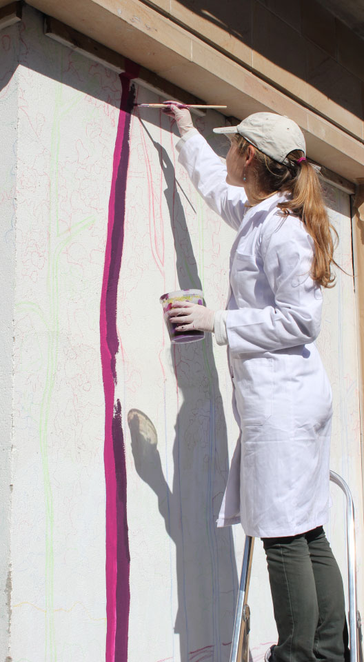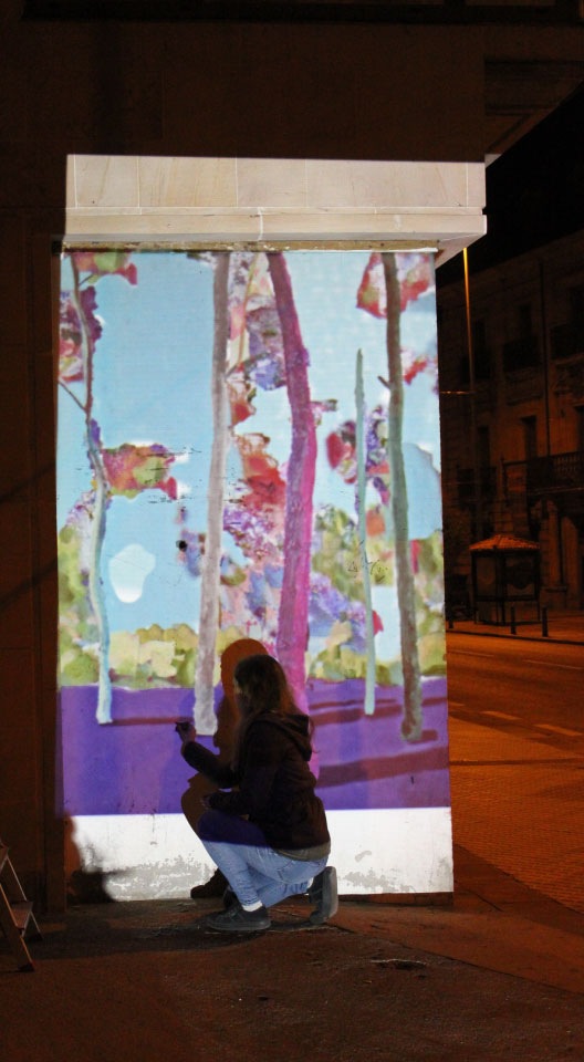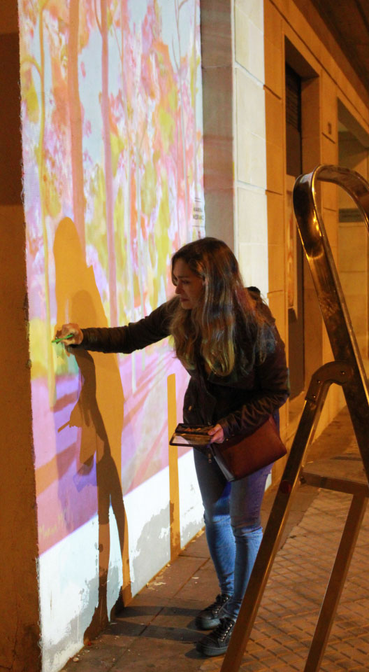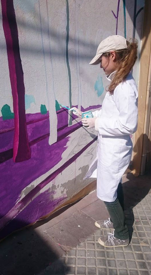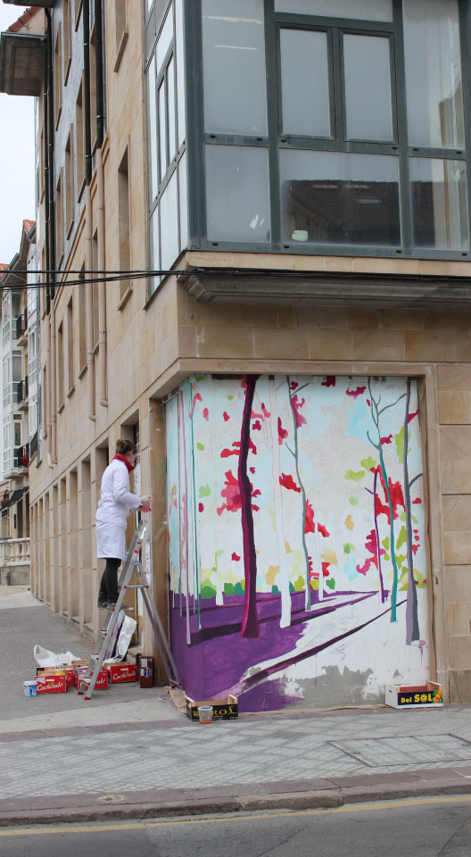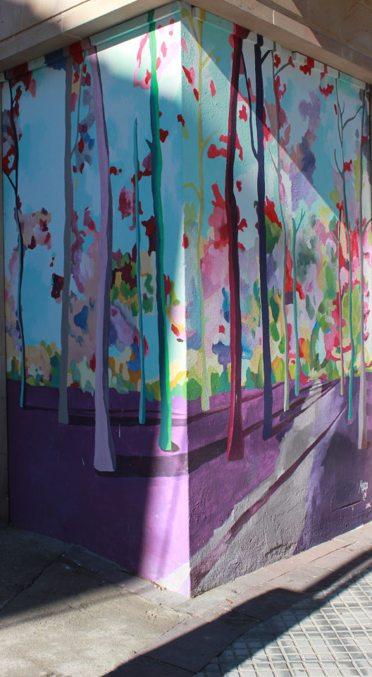 Marina nos invita a realizar un viaje por su bosque, con ello quiere que al pasar por su mural nos invadan sensaciones que ella experimenta en la naturaleza, como la alegría, la serenidad o el misterio. Desde luego, el juego visual que ha tramado a base de un conjunto de colores que se sostienen entre el entrelazado de las ramas y las sombras de los árboles, nos contagia su entusiasmo, y nos invita a tomar ese camino que ha marcado, para realizar tan maravilloso viaje sugerente y positivo. El arte de esta artista es muy característico, trabaja siempre con este tipo de manchas superpuestas y vivos colores